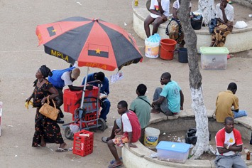 Symbols of the ruling MPLA are to be seen everywhere. Street traders set up their stalls under whatever shade they can find or make. Having a large umbrella ensures many friends or relatives will hang out for a chat in the shade through the heat of the day.