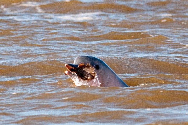 When we got closer to the mouth of the river, Mick spotted the first fins breaking the surface. It was a scattered group of about eight Guiana dolphins, and soon we realised that these little dolphins would not be easy to photograph! They were very unpredictable in their surfacing patterns, quick to roll at the surface and then they did not appear for quite a while. They reminded us a bit of harbour porpoises.
