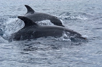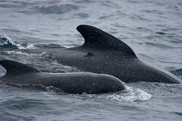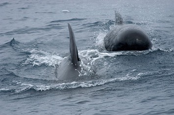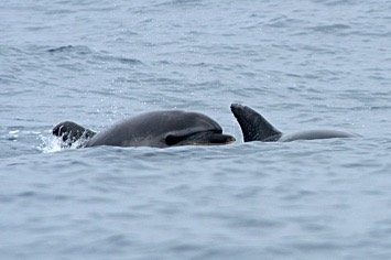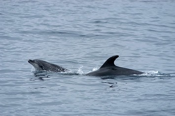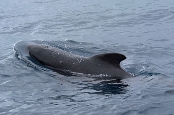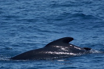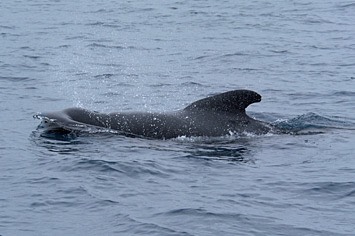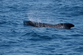 Long-finned pilot whales (Globicephala melas) were seen quite frequently too, sometimes in association with bottlenose dolphins. They were not shy to approach our yacht and we could clearly see their bulbous, beak-less heads and very broad-based dorsal fins. One individual, a big male with a white patch on its dorsal fin, had been seen in the previous' years study, too.