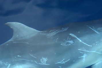 On one occasion, a group of bottlenose dolphins approached the vessel and a juvenile leapt right next to us. His body was still comparatively unmarked, in stark contrast to the adults, whose bodies were covered in battle scars!