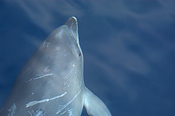The group then swam straight past the vessel, showing their bodies clearly in profile view. One of the animals was an adult male, clearly recognisable by it's brownish-cream colour and the many rake marks on its body and dorsal fin. These rake marks and nicks in the dorsal fin can be used to identify individual animals and by matching photos taken over the years, much can be learned about the social structure, habitat preferences and population size of Cuvier's beaked whales.