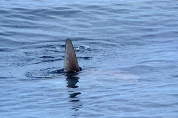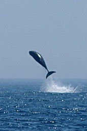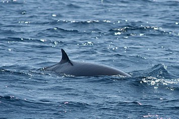 Only two very small groups of short-beaked common dolphins (Delphinus delphis) were encountered and both were associated with striped dolphins. But not every fin we saw belonged to a cetacean; there was a sunfish (Mola mola), too!