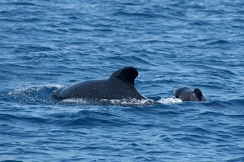 On another occasion a group of pilot whales, including several calves, paid us a visit and even started bow-riding: something that is rather unusual for pilot whales. A young calf stayed close by mum's side and appeared to be as fascinated by watching us as we were by watching it! Another calf that still showed its foetal folds, swam so close to the ship, that we could even see our own reflections on its glossy skin.