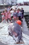 School children looking at stranded female Blainville's beaked whale, Aberaeron, UK