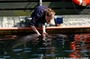 Trainer interacting with two harbour porpoises (captive), Kerteminde, Denmark