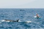 and very young calf surfacing near a traditional tuna fishing boat, Straights of Gibraltar, Morocco