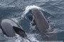 Long-finned pilot whale calf surfacing next to its mother, Bay of Biscay, Spain