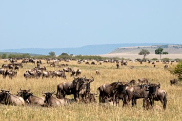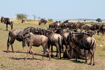 We turned up at the Talek gate first thing in the morning to pay our fees, which was a rather shocking 80 US Dollars per person per day! The rangers at the gate suggested that we should head towards the Keekorok area to see the wildebeest herds. First we saw a hyena carrying the severed head of a young wildebeest, which looked rather gruesome! Then we came across a wildebeest carcass, which was jealously guarded by a hyena and lots of vultures. But then we saw the living wildebeest – and plenty of them! There were wildebeest as far as one could see! Absolutely everywhere! There were vast numbers of them, with small groups of zebras dotted about among them.