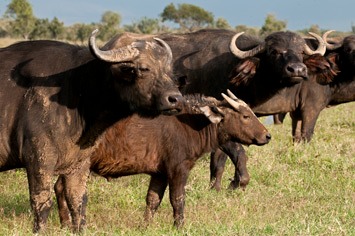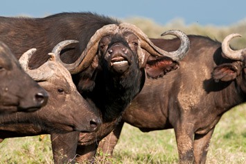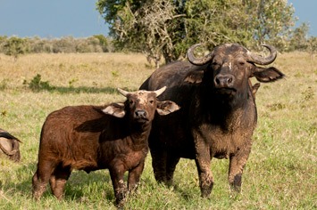 The night was quite cold and in the morning everything was wet with a heavy dew. We set off towards the eastern shore of the lake, but at the first muddy bit in the track we came across a buffalo road-block. They obviously didn’t want to get their feet dirty, so they just stood on the drier part of the track and refused to move out of the way. They came quite close to the car, snorting and sniffing us, but eventually let us pass. A bit later we came to an even bigger herd next to a very large very muddy area, they also appeared to be quite edgy and didn’t want to move. Mick leaned out of the car window and called to one of the bulls looking at us: “You buffalos are just like all bovines – bloody stupid!”. The bull immediately took offense and charged at us at full speed! The only buffalo-free space head of us was a sea of mud, but with an angry bull buffalo bearing rapidly down on us Mick floored the accelerator and went for it. Fortunately, the car was already in four wheel drive and we picked up speed, sliding to left and right with showers of sticky brown mud flying off the wheels. Maren lost sight of the buffalo as the rear window became caked in mud, but Mick could see him charging in the rear view mirror for quite some time. Luckily for us we made it to firmer ground and left the angry beast behind, still snorting at us. The lesson learnt was: Don’t offend a buffalo unless you have a clear route of escape!