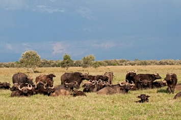 Back at camp we discovered that there still was no water in the showers and stand-pipe. Charles had spoken to some people and they promised the water would be turned on soon. After our siesta we did indeed have water, but none of the three showers worked! Given that we paid 25 US dollars per person for the campsite, this was rather pathetic! In the afternoon it looked as if it was going to rain, so we only went on a short drive. We photographed a herd of eland and some (peaceful) buffalos in nice light.