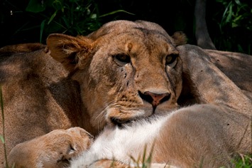 On one of the small tracks to the south of the lake we came across a lioness lying at the roadside. We stopped and she got up and slowly walked towards the car. She was extremely skinny and covered in flies; when she came closer we could see that she had two round, very deep puncture wounds. Maybe she offended a buffalo as well and didn’t get away as well as we had this morning? She rubbed herself against our car – certainly the closest we have ever been to a lion! It was a sad sight, and her chances of survival seemed very slim.