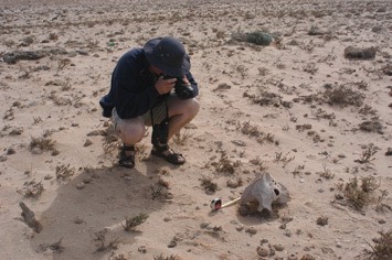 Today we travelled south through the increasingly arid landscape, filling up on the incredibly cheap, subsidised diesel (about 26 Eurocents/L). Access to the sea was limited by the dangerously crumbling sandstone cliffs, but we came across a new tarmac road down to the beach. There were several groups of people down there, mainly Arab families and fishermen and one big German hippy truck. Right next to where we parked, we found a piece of harbour porpoise jaw with the characteristic spade-shaped teeth! We camped in the desert not far from the Dakhla turn-off, watching hoopoe larks doing their manic aerial display and tried stalking desert wheatears and Thekla larks to photograph them.
