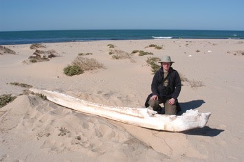 We would have liked to stay at Timiris, as it was an excellent bird hot-spot, but the strong wind was still blowing. We returned to the National Park Headquarters to measure and photograph the newly arrived third baleen whale skeleton. The jaw measured four metres from tip to tip and the overall length of the skeleton as displayed was 15 metres. We drove slowly along the shore of the Bay de St Jean, finding the remains of at least a dozen dead turtles, some nearly complete, others just a pile of bones. Later we left the beach and headed north, inland. We crossed a long stretch of gently undulating sand with a thin cover of grasses, where the piste was little used and hard to follow. But navigating by GPS waypoints we arrived at Iwik. This route seemed easier than the dune crossing on the way south, especially as the Harmattan wind was still blowing and the air was full of sand. At the National Park station in Iwik we found another large whale skeleton on display, together with a collection of dolphin skulls, one entire dolphin skeleton and a toothed whale jaw. Iwik looked unattractive in the sand-laden wind, so we carried on north to Cap Tagarit. Just north of the small village of Ten-Alloul we found the remains of at least eight turtles in a small rubbish dump. At Cap Tagarit Mick tried snorkelling, but the visibility was only half a metre due to the choppy seas. Then he tried fishing but caught only one small fish and let it go, then lost a second big one. So back to tuna curry for supper, which we ate in the moonlight. As we ate, a small fox appeared and started sniffing around where we had poured the oil from the tuna tin. It didn’t react when we shone a torch on it and in fact it walked right up to within two metres of us, apparently without fear. We had ample time to study it at close quarters – it was a small fox with large ears and long slender legs. It was a pale sandy colour with two dark spots on its face under the eyes and a white tip to its tail. Looking at the Kingdon field guide we identified it as a Ruppell’s fox, although we were outside the distribution for this species given in the book. The fox returned again a little later while Maren was having a pee, giving her a bit of a fright by its sudden appearance.