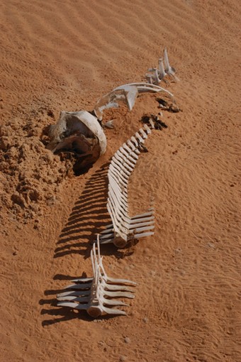 Because our Mauritanian visas were dated for January 1st we needed to find somewhere to camp for a couple of days. We had intended this to be Cintra Bay, so we drove out on the bleached sandy piste along the headland that forms the northern arm of the bay. To our surprise, the bay was a vast dry expanse of sand – it is really a sebkha, a seasonal lake rather than a sea bay. Finally reaching the end we came to a fishing village on the headland – a collection of huts, piles of nets and buoys, with a couple of small tractors working their way through the narrow lanes between the huts. As we sat and looked, wondering whether to turn back, a soldier and policemen came out to meet us. After the usual greetings they asked if we had any beer. Alas no, we lied. They politely suggested we go elsewhere, and so we did. Pressing ever further south towards the border, we at last found a way to drive off the road towards the sea, and threaded our way across mainly hard sand and stones to a thin line of tamarisk bushes behind the low dunes that backed a long beach. As we pulled Scottie in behind the largest bush, we saw the huge bones of long dead whales – ribs and vertebrae scattered around our campsite. This seemed like a good omen, so we stayed at “Whalebone Camp” until New Year’s Day.