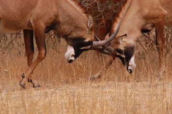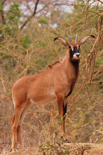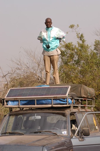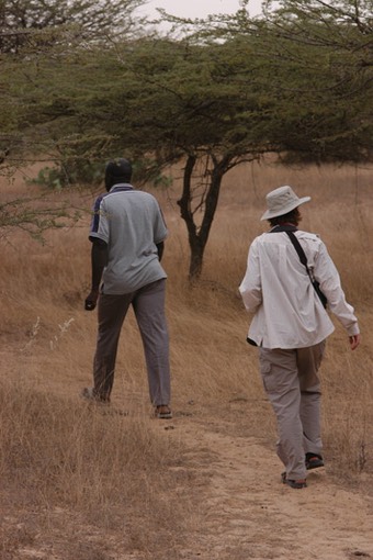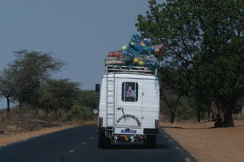 We woke up to meet several visitors to the camp; people walking to and from a small village nearby stopped to gaze at the car with a little house on top. The road to Tambacounda was badly pot-holed so progress was slow at first, and the bank was closed for lunch when we arrived at the small town on a key road junction. But there was a good internet booth and plenty of fruit to buy while we waited to change money. Finally, we arrived at the Dar Salaam gate to Niokolo Koba National Park around 5pm to learn that a guide was obligatory while driving around in the park. Tricky, since we have only two seats in the car. But our appointed guide happily climbed onto the roof, where he was joined by one of the staff from the Simenti Hotel who needed a lift in to work. On the long piste into Simenti we saw a herd of roan antelopes, some kobs, bush-bucks, duikers, baboons and a pair of huge ground hornbills. But it was immediately obvious that the dense bush would make it very difficult to see much of the area’s wildlife. A pickup full of armed National Park rangers protested (mainly to our guide) that we were driving later than regulations permit – but nevertheless told us to drive very slowly along the last few kilometres in the fading light to Lion Camp – a small collection of huts on the banks of the river Gambia. There were two Japanese guys there – driver and co-driver of a Toyota in the Paris-Dakar rally – one had ordered dinner but had some stomach upset, so he gave us his plate of chicken and spaghetti.