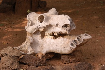 While we were getting ready for departure, Maren started to feel unwell with an upset stomach (We decided to blame it on the salad or fruit we had last night in the restaurant). We stopped in Kedougou, a thriving little market town, for phone calls, fuel and peanuts. A pick-up with dead warthog stretched across the back passed us and we came across check points for the enforcement of hunting regulations. Maren was still not feeling too good, so after clearing the town on the road heading back into Niokolo Koba, we pulled in at another French hunting lodge at Mako, where we could take a hut with bedroom, shower and toilet. The lodge is set in dense bush on the banks of the river – full of birds and five hippos on view near the lodge.