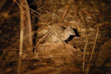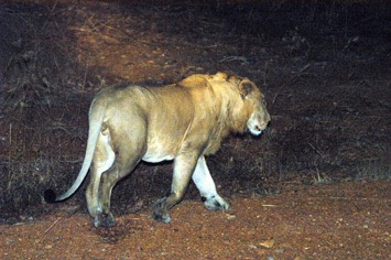 Our guide at Simenti told us that, although there certainly were lions in the National Park, they were almost impossible to see. We met an American VSO at Dar Salaam who showed us a photo of a lioness and her cubs taken by one of the other volunteers beside the main road to Kedougou, but sightings were said to be extremely rare. Having driven down the Tambacounda – Kedougou road already, we conceived the idea of driving back up it through the National Park in the dark. Driving at night is something we have completely avoided, but this was a newly surfaced road with no potholes, no villages so no donkey and bicycle traffic, and a very low density of long-distance traffic. When the alarm went off at 4 am we found ourselves covered in bed bug bites. Yuk! So much for expensive French run hunting lodges. Pulled out onto the moonless road at 4:45 and we straight away started seeing small creatures of the night. First a small jumping rodent, then a nightjar in the road and large owls. Then the first good view of a mammal – a genet that sat mesmerised by our powerful lamp long enough to take some photos. We saw three or four genets in all. We continued driving on up the middle of the road very slowly with the windows open. Suddenly a leopard dashed across the road in front of us, then circled around in tall grass from which its head peered out as it stared straight at us. It circled around to look at us from a couple of different places, but always stayed behind dense cover. Carrying on and now around half way between Niokolo Koba bridge and Dar Salaam, we suddenly came alongside two lions standing right next to the road! We stopped and gazed with amazement at these big, slow moving animals, as they walked past us and along the road in the other direction. That left us desperately trying to take pictures out of either window while doing a slow 3-point turn to face the animals as they mounted the tarmac and walked casually away down the road. We left them to their business, turned the car back around and drove on, babbling excitedly about our close encounter with the king of the beasts. They did not have well developed manes but from the photos you can see they were males. A duiker and a warthog was all we saw before the dawn came up, when we stopped at a river bridge where baboons were still high in the trees and a gonolek came out in the open to sing and be photographed. It was still early by the time we neared Tambacounda, where we turned off on the road leading to a crossing point into the Gambia. On the way, we passed a dead serval cat in the road. The border crossing was very easy, took less than half an hour and cost only £1, although that turned out to be a spurious fine for crossing the border outside normal office hours (which we didn’t). We went into Basse to get visas and then drove on down to Georgetown, via a ferry crossing onto McCarthy’s Island, and so to the Bird Safari Camp. It was a long day, but one of the best of the trip.
