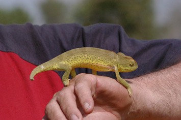 We drove down to the coast from Georgetown on the worst road we have encountered so far. We saw a chameleon on the road, which we rescued before it was run over by a car and a 1 m long green snake, which we nearly ran over, but managed to miss by a few centimetres! Very badly potholed tarmac meant constant bumps and much of the time driving with at least two wheels off the road on the side. We came across two guys in a hired Toyota 4x4 from which a front wheel had come off. Scottie survived the beating, but after this eight hour hammering, Maren was totally wiped out when we arrived at Boboi Beach Lodge near Kartong, a camp at the southern end of the Gambian coast, at 18:15.