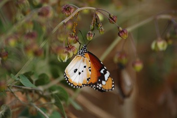 The early morning watch didn’t yield any dolphins again. After breakfast we walked into the village, where we were soon surrounded by school kids having their mid-morning break. They all wanted to hold our hands and followed us every step. Then one of the teachers invited us to have a look around the school. We met the headmaster in his office; he told us a lot and also very openly asked for a donation to help fund things for the school and support the parents. After looking into all the classrooms and even listening to a song especially performed for us, we headed back towards the lodge. On the way into the village we had passed many plantations of cannabis. It seems this is the only crop grown here – quite openly – relying on black magic for protection, as a curse is said to befall any state official crossing to the island with intent to harm the activities of the islanders. At least, that’s what they say. So walking out, we called in for a guided tour of a ganja farm. Ripe flower heads were laid out in thick carpets to dry. The compound was all cultivated, except for a small drying yard next to the house and a well dug in the sand. A coarse fish meal, really just dried lumps of fish, was used to fertilise the plants. Apparently, farmers get around £8 per kilo. In the afternoon, Maren chased the butterflies to get some decent pictures and Mick relaxed near the sea, which was rather choppy. So again – no dolphins but probably a head of a turtle sticking out of the sea. As we were the only guests left, we had a private paraffin lit dinner of fantastic chicken with potatoes, rice, carrots and juice, followed by chocolate cake! The old guy who cooks these great meals apparently is the first cook of the first hotel in the Gambia. He was very pleased when we praised his food. Just as in Boboi, everybody here is extremely friendly and it is a real shame that there aren’t more guests here!