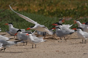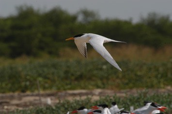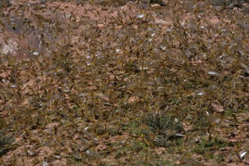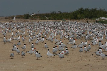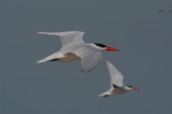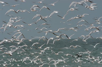 We left Nouadhibou at 7:30, heading towards Nouakchott, the capital of Mauritania. We followed the railway line and turned off on the piste OK, which runs along the shore of the Baie du Levrier. Feeling pretty confident of the route we didn’t stick to the GPS waypoints but just followed the most prominent tracks in the sand. After some time we noticed that we were heading some 10 or more kilometres inland from our waypointed route and the piste was very deeply rutted. Guessing we were on the truck piste, we headed across open desert to rejoin our intended route. We encountered some pretty soft sand, but Scottie coped well after we let the tyre pressure down a bit. On the way, we also came across an enormous swarm of young locusts seething across the dunes. It was an truly awesome sight! After rejoining the piste, we made our way to Cap Tafarit in the Banc d’Arguin National Park, but the nearby Cap Tagarit looked more interesting so we set up camp there. There we saw a group of around twelve roseate terns- a scarce seabird that breeds in the UK - resting on a sand bank.