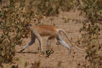 We left our comfy bed at 6:30 and drove up to the ferry terminal in Banjul. We missed the next ferry but after getting our tickets organised we caught the following one. The cars were loaded tightly so we could only just squeeze out to climb up to the upper deck. Just before reaching the north bank of the Gambia river we saw two dolphins. Without binoculars we couldn’t identify the species with certainty, but they were probably bottlenose dolphins. Some dolphins at last! We drove up to the Senegal border, which we crossed in record time; no fees to pay and no requests for cadeaux! We drove to the Gite de Bandiala in the south of the Sine-Saloum Delta. They offered no camping there so we only had a cold drink, watched Patas monkeys at their artificial water hole and then carried on to the National Park headquarters near Missirah. We did a guided walk with Kanoute and saw warthogs, a martial eagle carrying off a kill while a squirrel screamed at it, and then four bushbucks, two of them handsome males. We arranged a boat trip to look for dolphins the next day. Hyenas were howling as we went to bed.