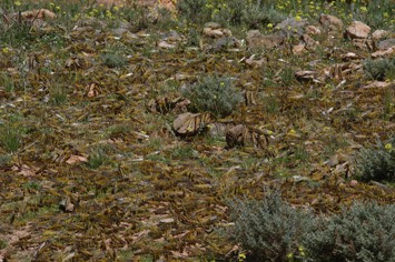 We drove from Tan Tan Plage to Essaouira. First we stopped to photograph the newly completed 3-D camels at Tan Tan. Our picnic lunch was eaten amid a vast swarm of locusts in the argan forests just north of Tiznit. Just north of Agadir we stopped briefly at the estuary at Tamri, but alas no waldrapps and virtually no birds at all. There was a fierce wind blowing so we decided not to camp on the coast as originally planned, but to carry on to the walled camping compound in Essaouira. That evening, while eating our tuna curry in the car, we heard strange noises from the back. Peering through the back window we at last saw our mouse, sitting on top of a fresh mango! We attempted to trap it by luring it into an empty water bottle using mango as bait, but it was too quick and jumped back out of the bottle when we jerked it upright with a long piece of string.